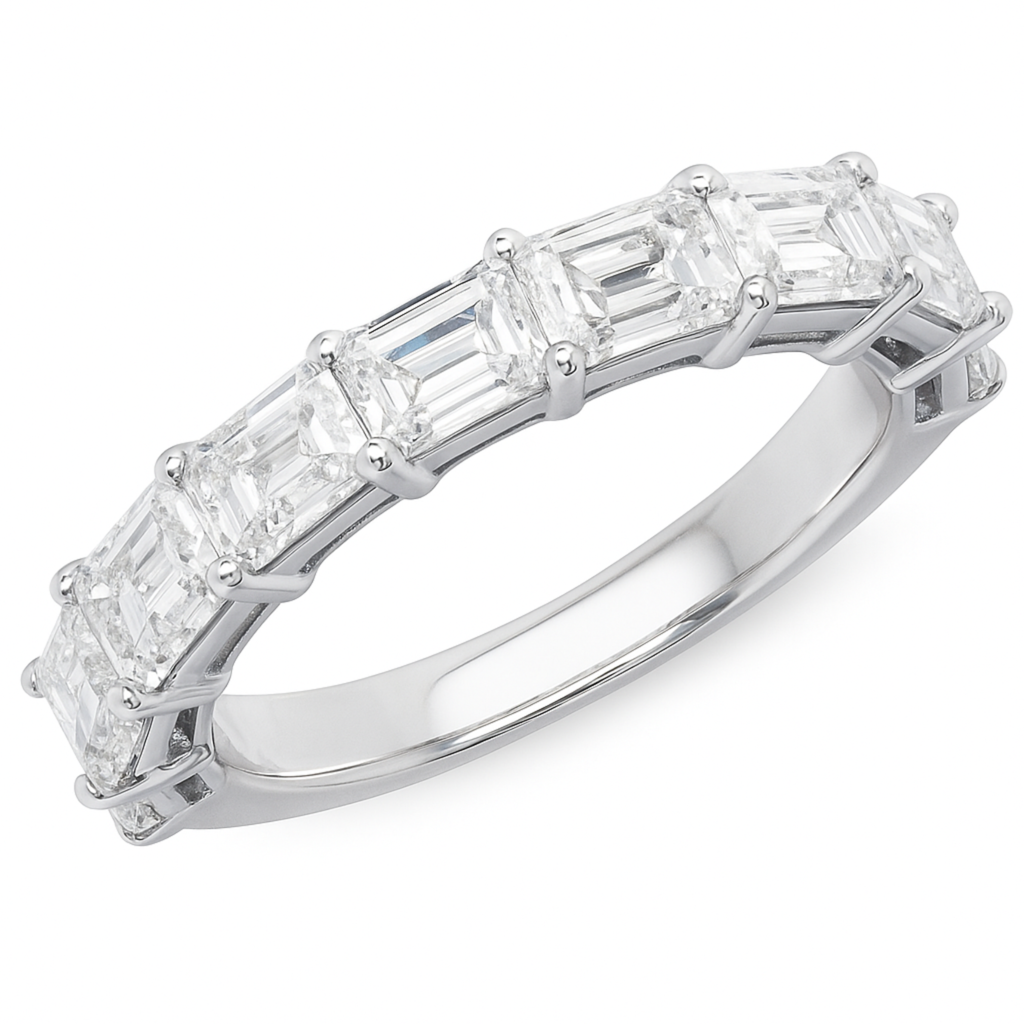 Timeless elegance meets modern craftsmanship in this exquisite 18K White Gold Shared Claw Wedding Band, featuring nine emerald-cut Lab Grown diamonds with a total weight of 2.70 carats. Each diamond is precision-set in a refined shared-claw design, allowing maximum brilliance and light reflection across the perfectly matched stones.