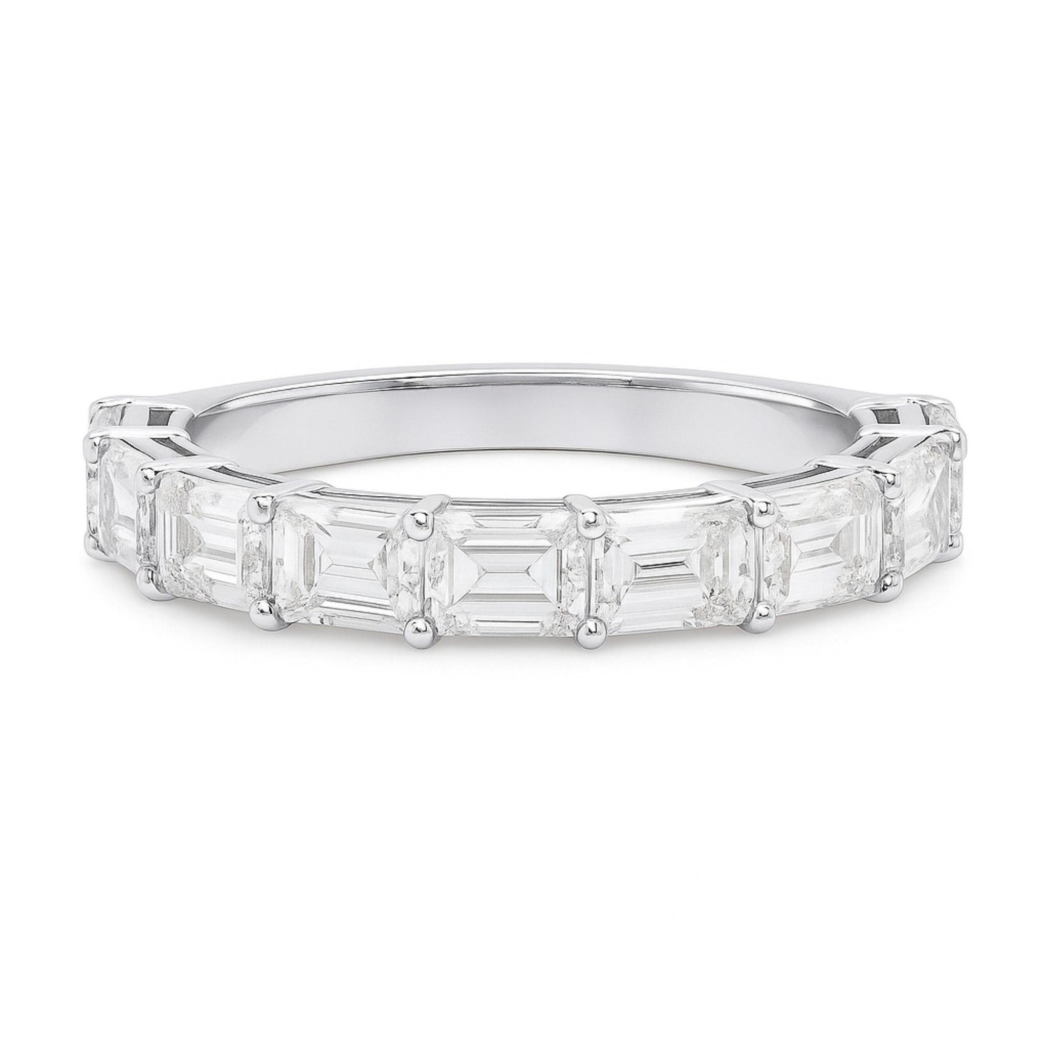 The sleek white gold band complements the clean geometric beauty of the emerald cuts, creating a sophisticated piece that pairs flawlessly with engagement rings or stands alone as a statement of enduring love.